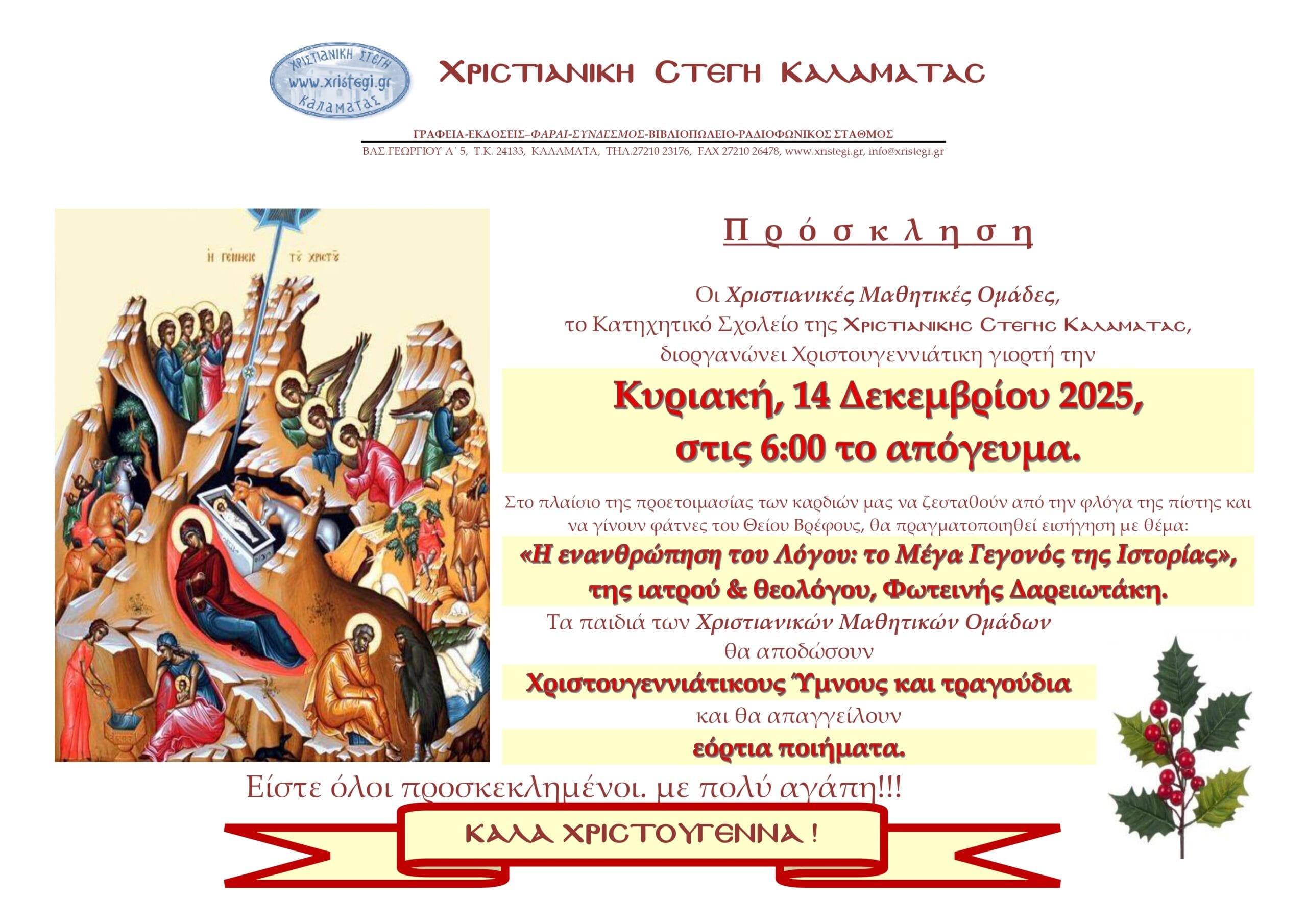 Στο πλαίσιο της προετοιμασίας των καρδιών μας να ζεσταθούν από την φλόγα της πίστης και να γίνουν φάτνες του Θείου Βρέφους, θα πραγματοποιηθεί εισήγηση με θέμα: